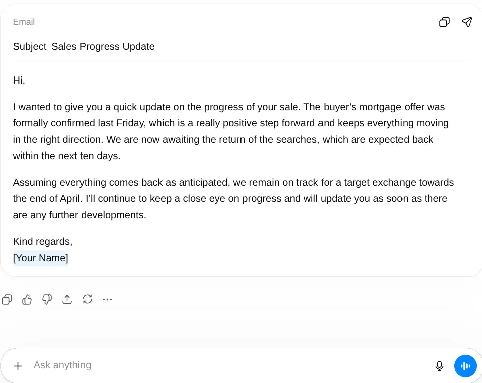 The AI way: “Write a vendor update email. Mortgage offer confirmed 12th March. Searches ordered, back within ten days. No issues. Target exchange late April. Keep it reassuring and professional.”